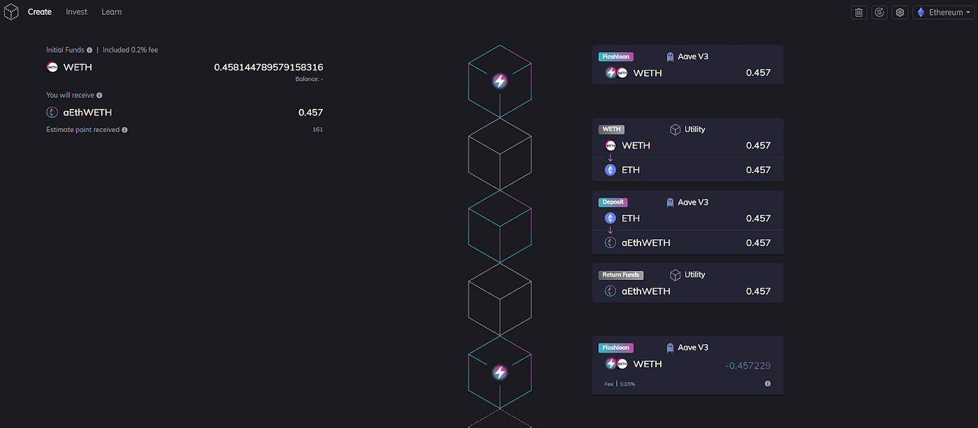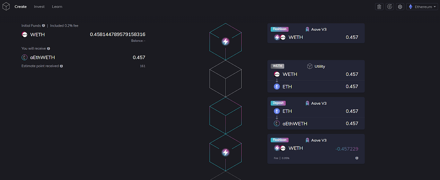 - Insert a āFlashloanā cube in the amount you wish to increase your exposure by. Based on the above example, we will take a flash loan for 0.457ETH (or $800 value)